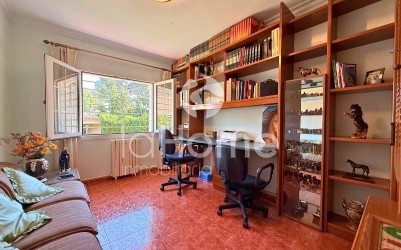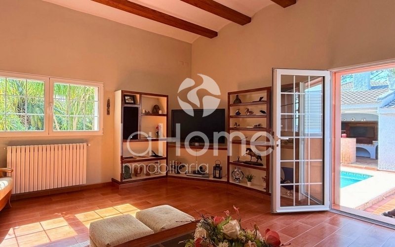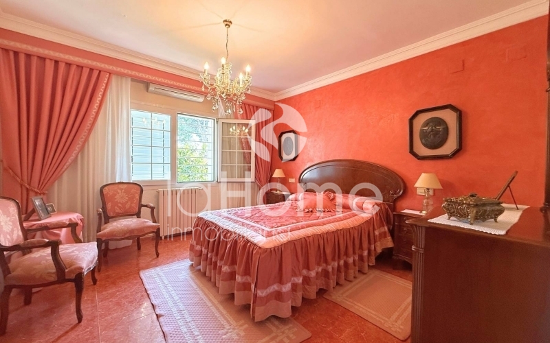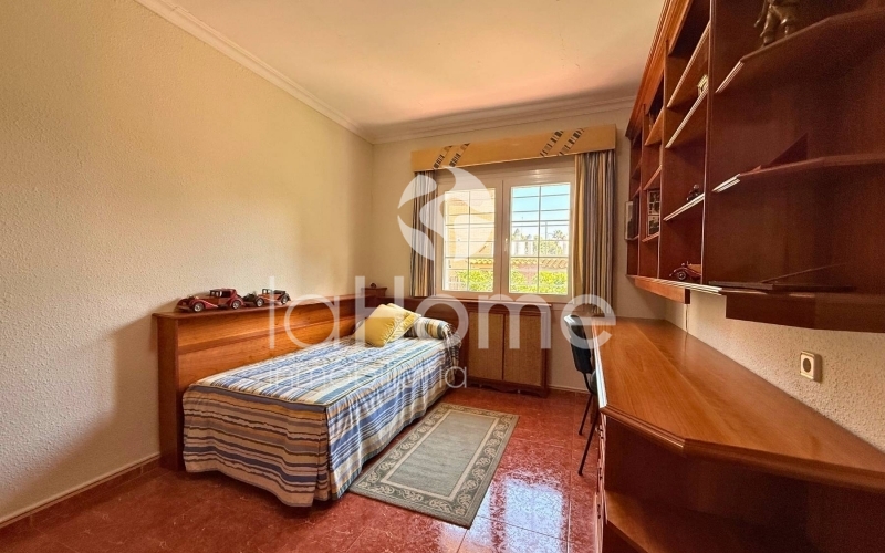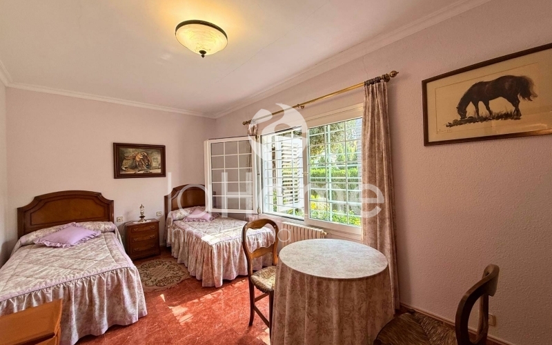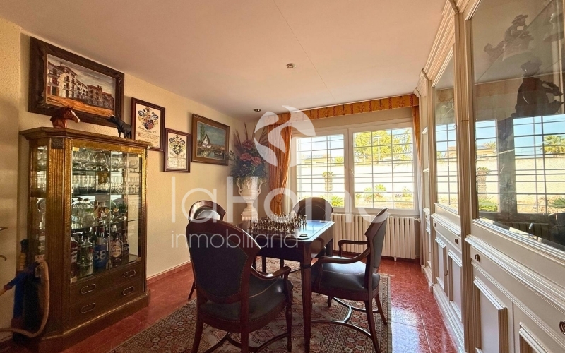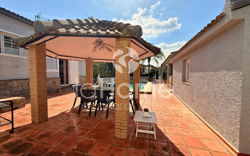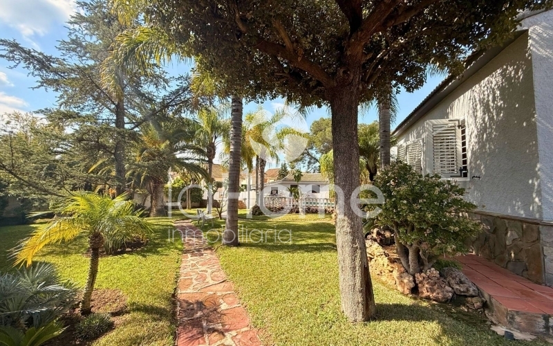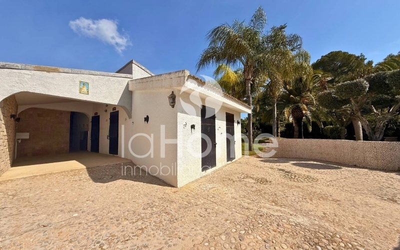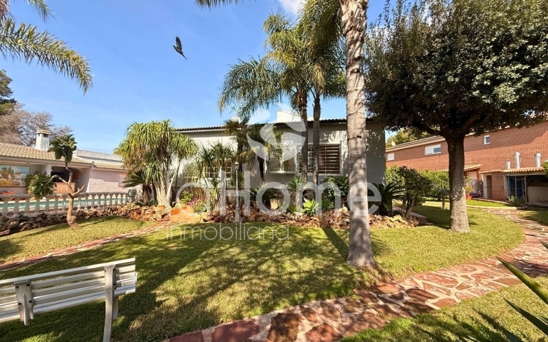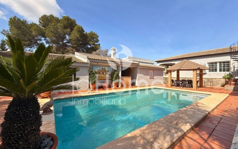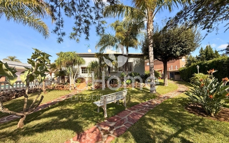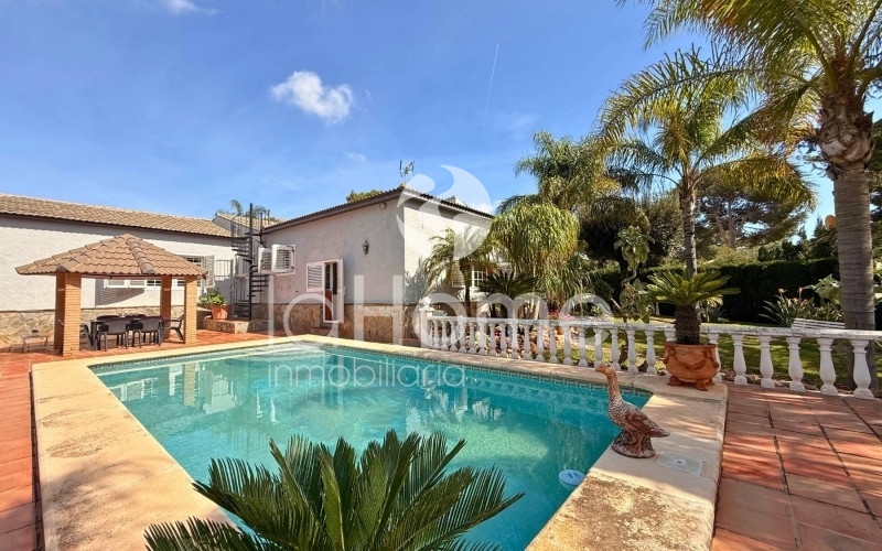 Outside, you can enjoy a magnificent porch and a gazebo by the pool, ideal for relaxing or sharing time with friends. It also has a second building that houses a garage for two vehicles, a paella grill, a dressing area, and stables, perfect if you enjoy the outdoors or have animals. The plot, surrounded by established vegetation with coconut trees, palm trees, grass, cypress trees, and other trees, offers a very green and peaceful environment, ideal for disconnecting and enjoying nature in your own home.