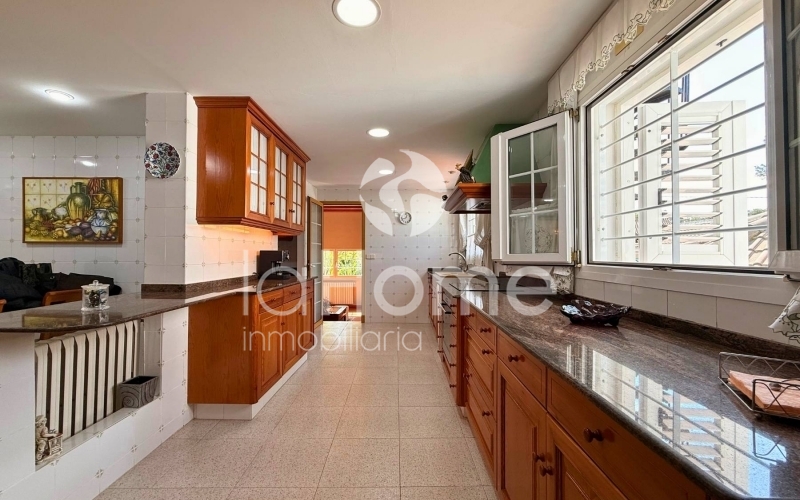 The home boasts a super-bright family room with high ceilings and wooden beams and access to the outdoors, another much more elegant and spacious living and dining room for events, and a games area for weekend getaways. There is also a large kitchen with a dining area for everyday use and a laundry area.
