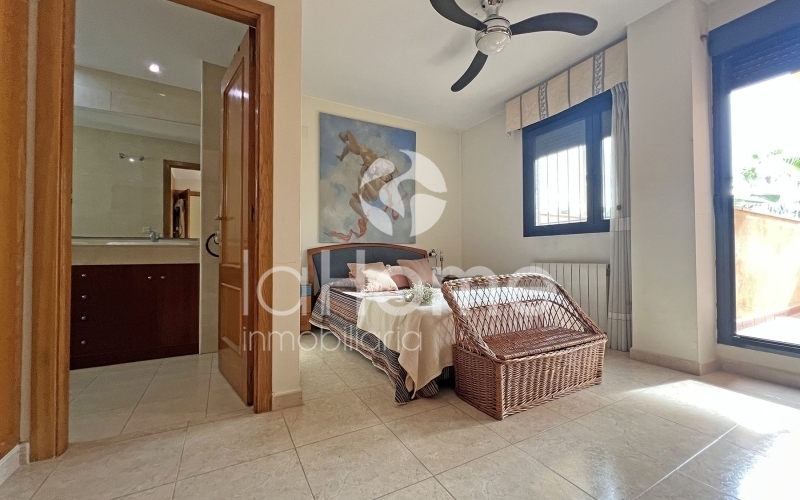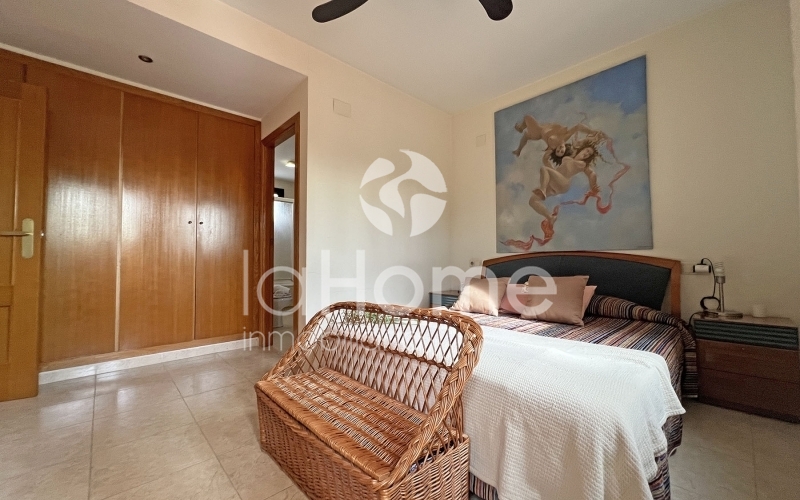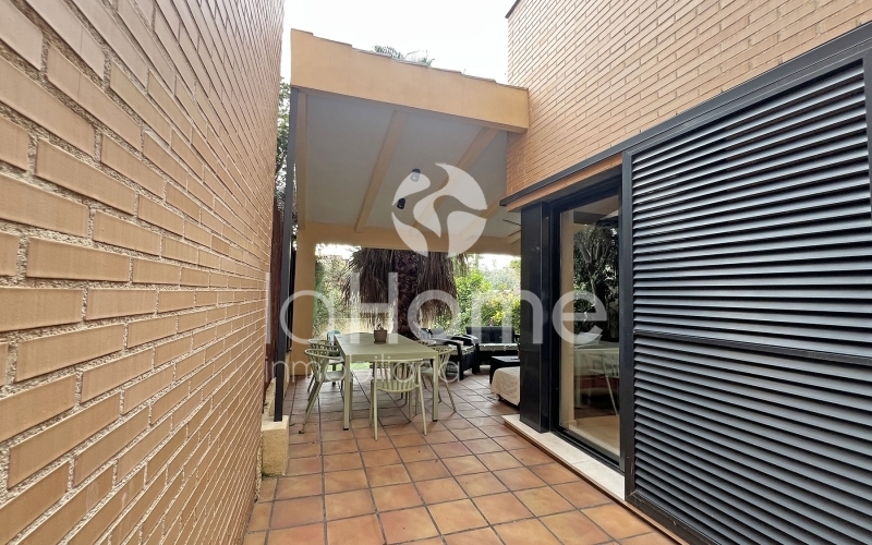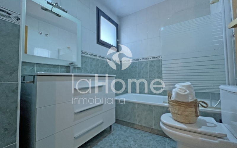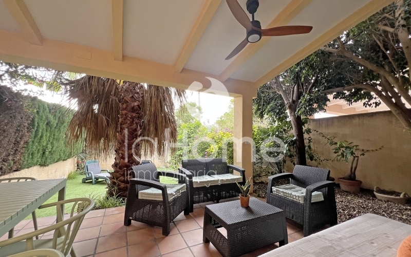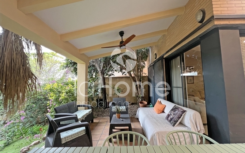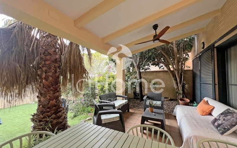 En el exterior, un acogedor porche invita al descanso, mientras que el jardín trasero, cuidadosamente distribuido, se convierte en un auténtico oasis privado. Cuenta con zonas de relax, espacio para barbacoa y área de juegos infantiles. Desde aquí se accede directamente a la piscina comunitaria, perfecta para disfrutar de los días soleados.
