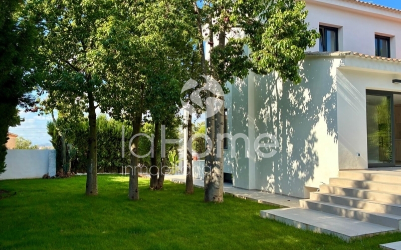 El exterior ofrece un entorno privado y tranquilo, perfecto para disfrutar durante todo el año. Cuenta con piscina privada de 10 x 4 m, zona de solárium y un jardín consolidado con césped natural y árboles de gran porte, ideal para el descanso y las reuniones al aire libre.
