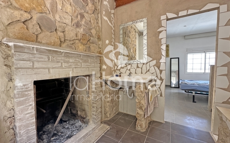 El interior de esta casa es luminoso y diáfano, cuenta con cocina abierta, amplio comedor con chimenea y una habitación integrada en el espacio principal. El baño es cerrado y dispone de bañera.