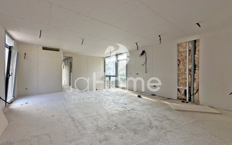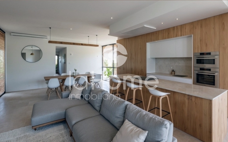 En la zona de día hay un salón comedor con cocina abierta que se integra perfectamente en un ambiente moderno y luminoso, con salida directa a una terraza con piscina privada, perfecta para disfrutar del sol, el aire libre y las vistas al bosque.