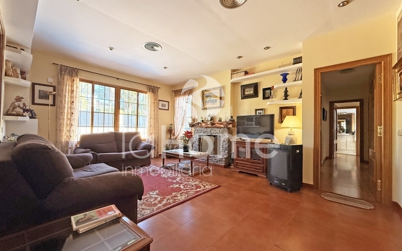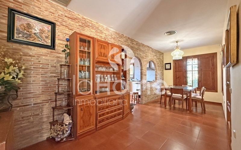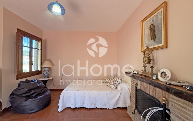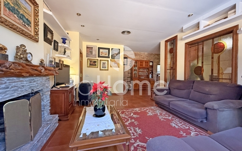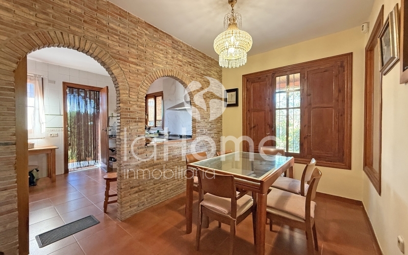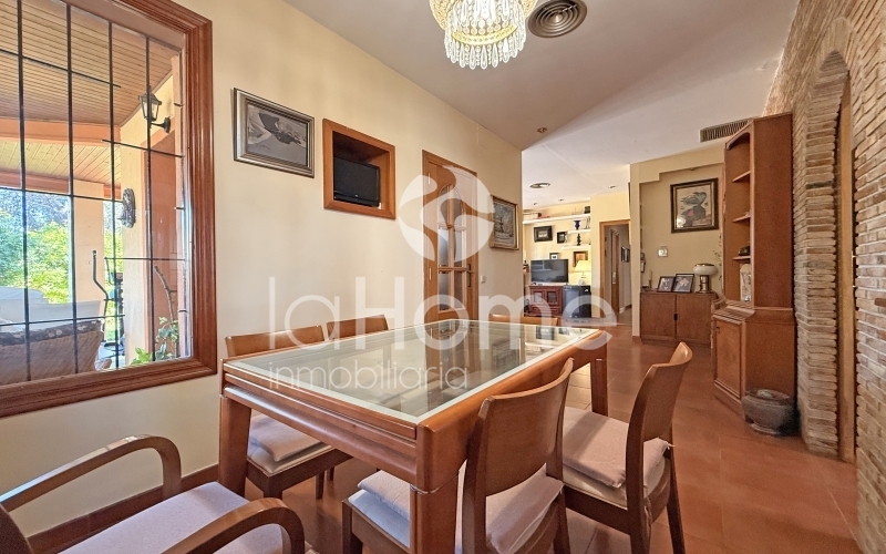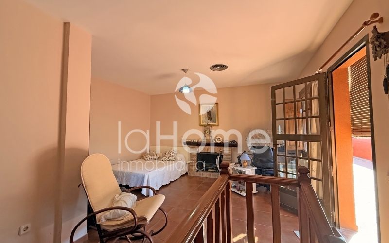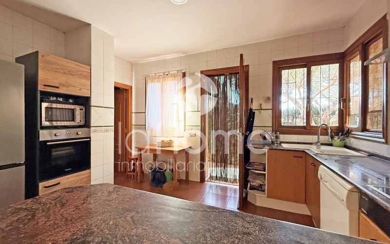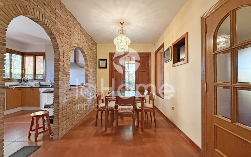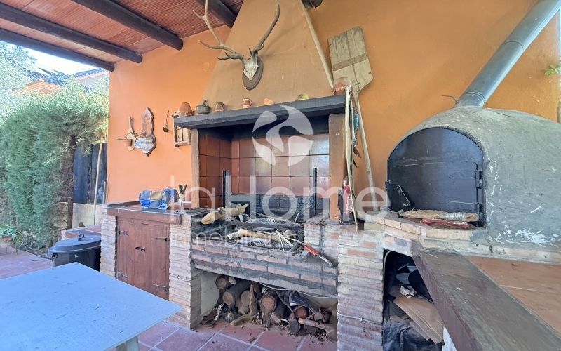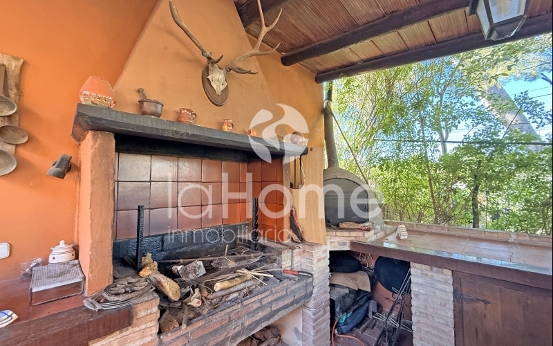 El salón-comedor es muy amplio y cuenta con chimenea, ideal para reuniones familiares o disfrutar de momentos acogedores. La cocina independiente tiene salida directa a una terraza equipada con paellero y horno moruno, perfecta para comidas al aire libre y reuniones con amigos.