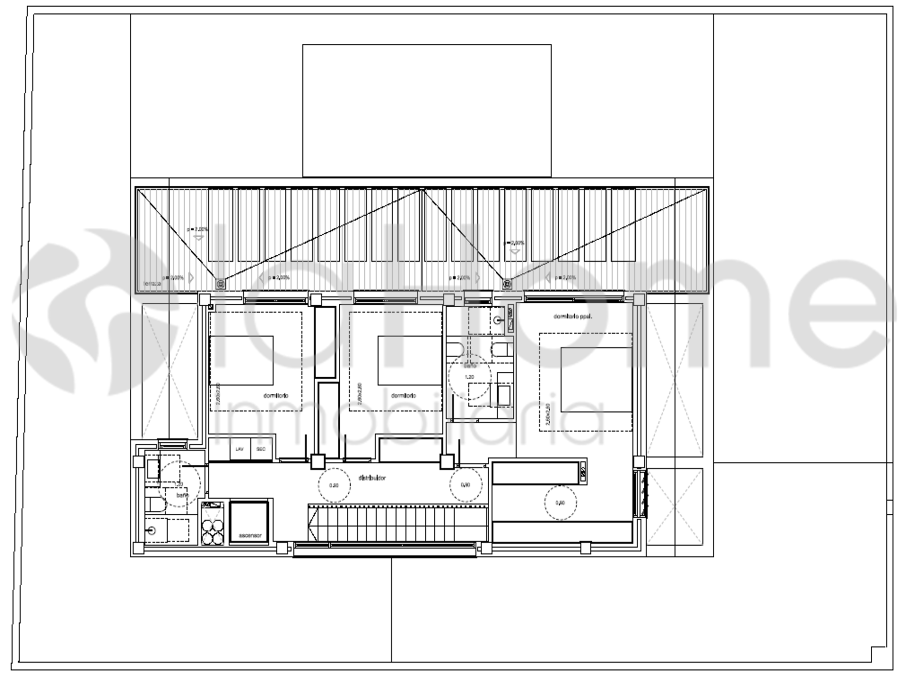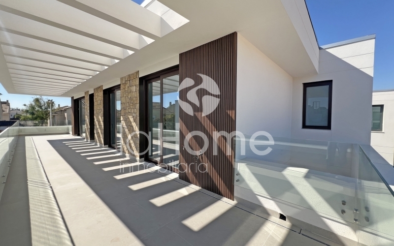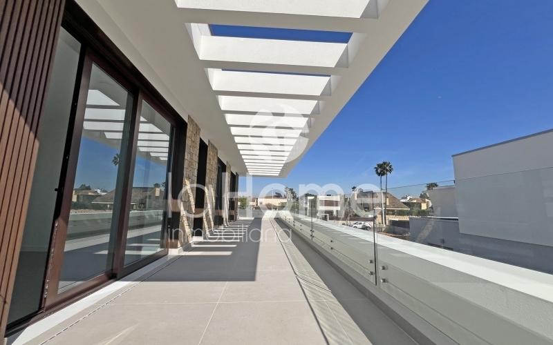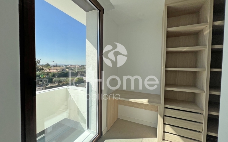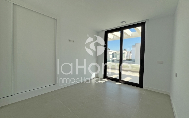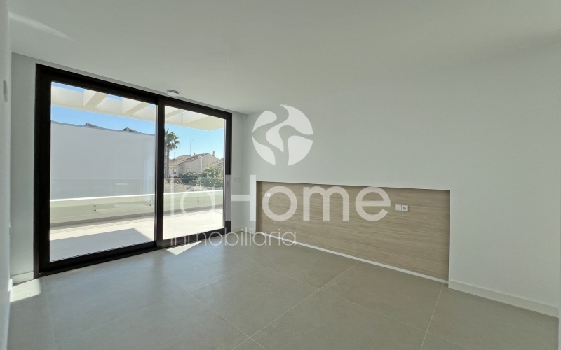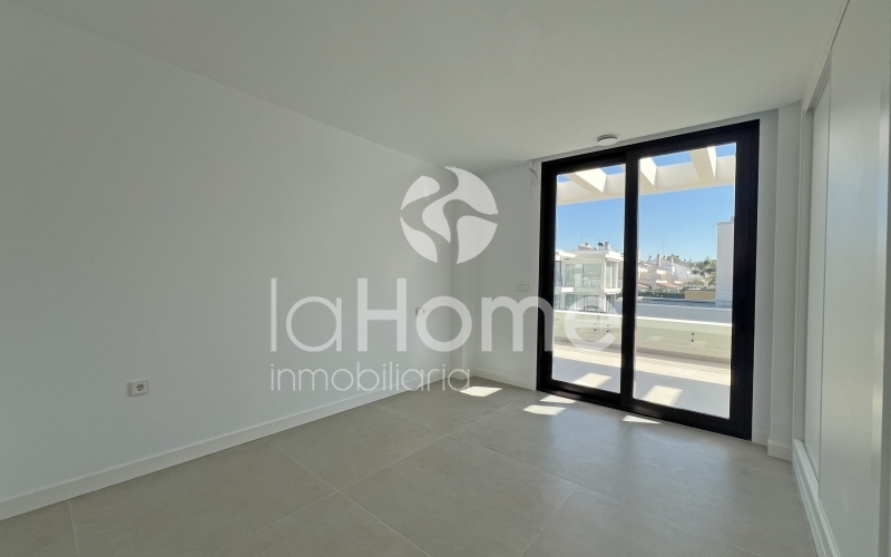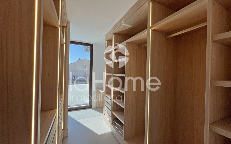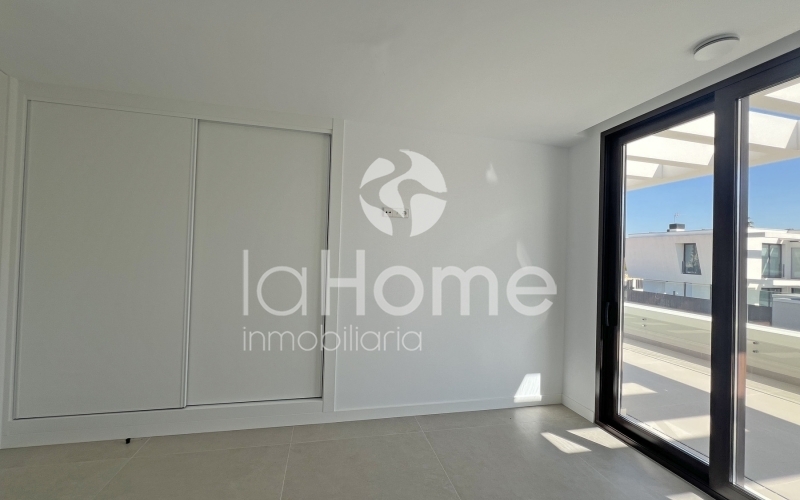 La planta superior alberga tres dormitorios dobles con armarios empotrados, uno de ellos en suite con vestidor y baño privado, además de otro baño completo. Todas las habitaciones tienen salida a una gran terraza.