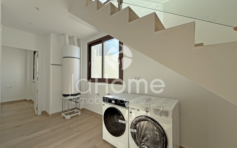 La planta principal ofrece un luminoso y amplio salón-comedor con cocina abierta, creando un ambiente moderno y acogedor. En este nivel también se encuentra una práctica zona de lavadero, una habitación ideal para invitados o despacho, y un baño completo.